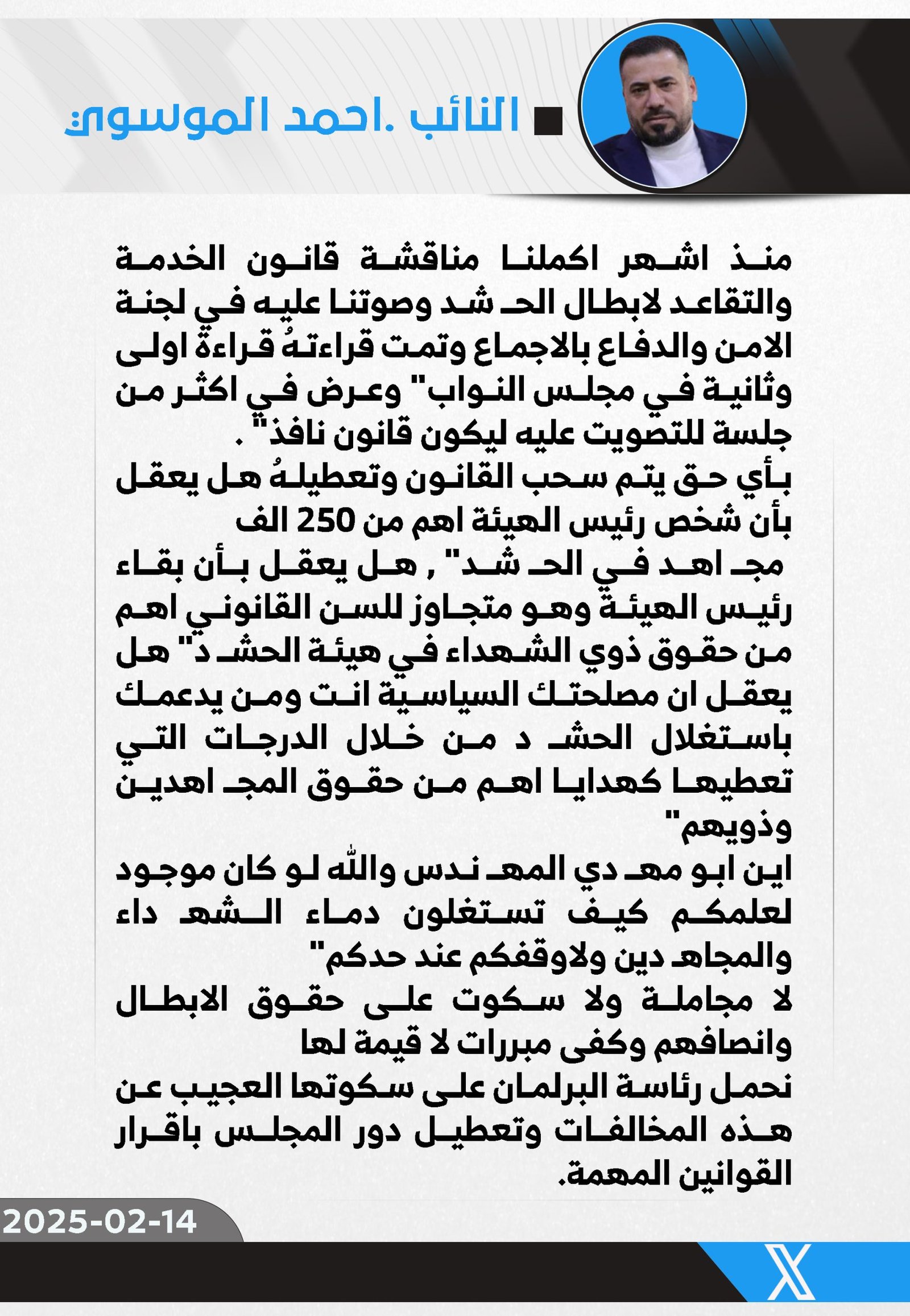 المزيداستنكر النائب عن كتلة الصادقون، أحمد الموسوي، الجمعة، سحب وتعطيل قانون الخدمة والتقاعد لمنتسبي الحشد الشعبي بعد استكمال مناقشته والتصويت عليه بالإجماع داخل لجنة الأمن والدفاع، فضلاً عن...