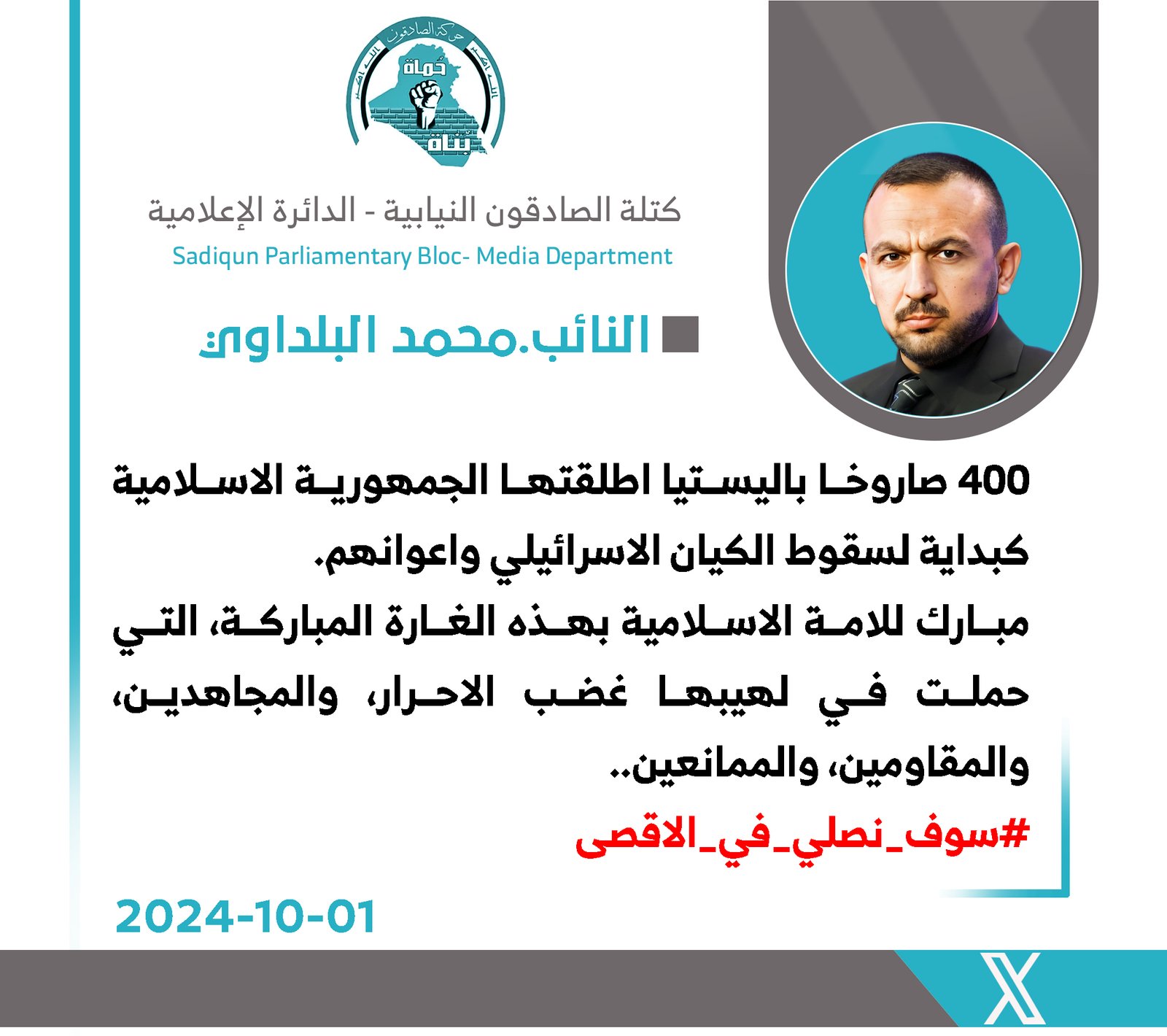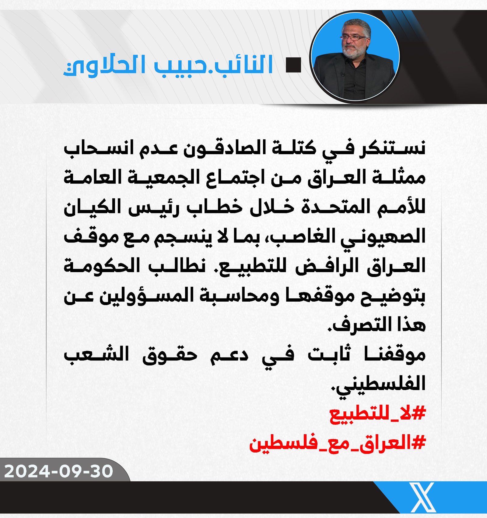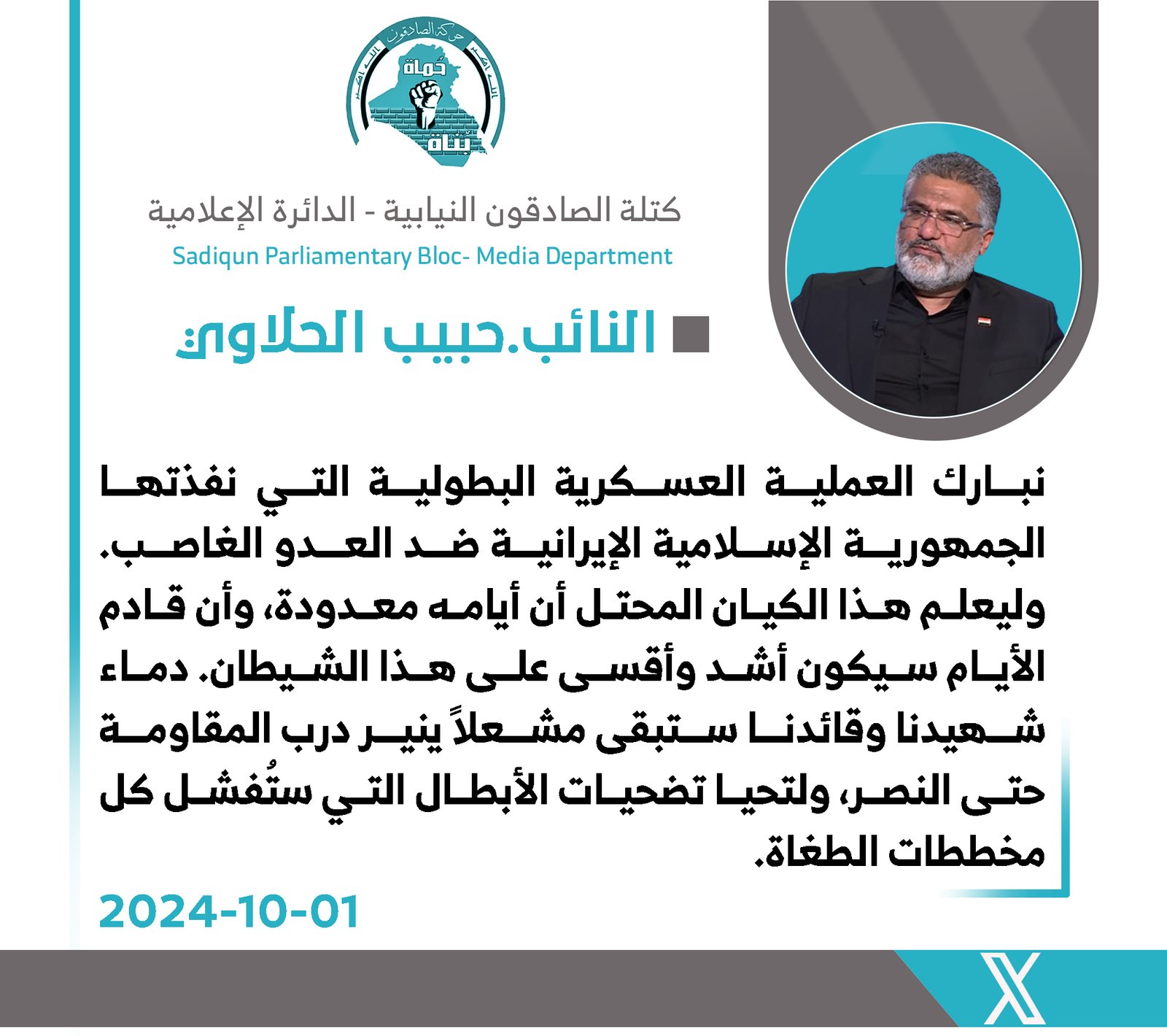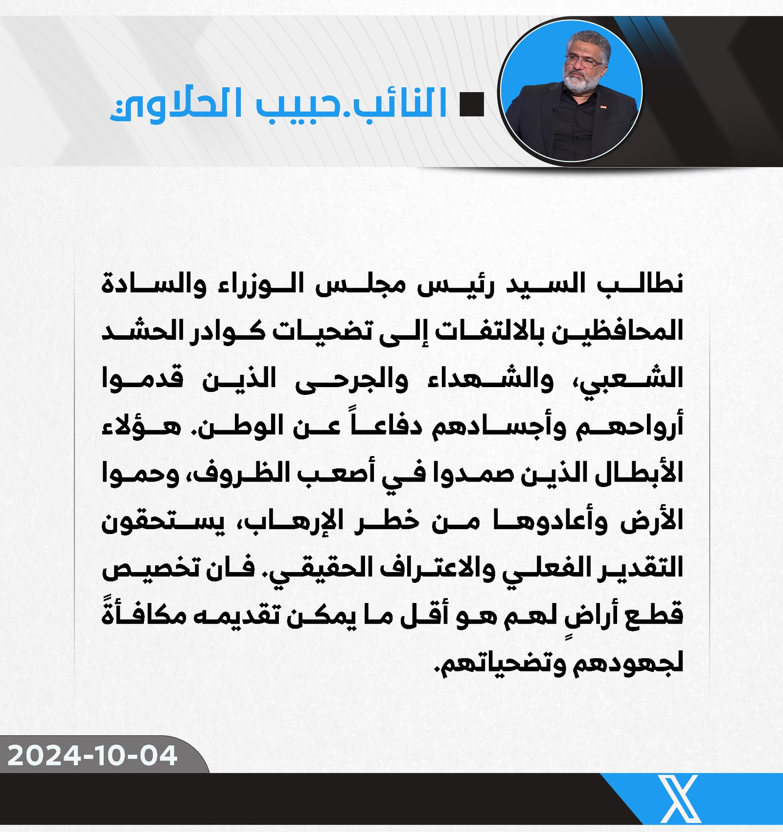 دعا رئيس كتلة الصادقون النيابية، النائب حبيب الحلاوي، ، اليوم الجمعة، رئيس مجلس الوزراء المحافظين إلى ضرورة تقدير تضحيات كوادر الحشد الشعبي، وخاصة الشهداء والجرحى الذين بذلوا أرواحهم...
