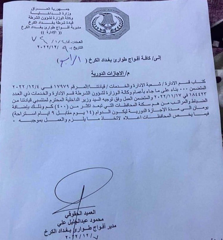 وبحسب وثيقة، اليوم الثلاثاء، أنه “بناء على ما جاء بأعمام وكالة الوزارة لشؤون الشرطة قسم الادارة والخدمات ذي العدد ١٨٤٤٢٣ في ۲۰۲۲/۱۱/۱۷ والمتضمن العمل وفق توجيه السيد وزير الداخلية المحترم لمنتسبي قيادتنا من الضباط والمراتب من هم سكنة المحافظات التي تبعد اكثر من (٤٠٠) كم وذلك بإضافة يومان الى مدة الاجازة الدورية ليكون الدوام (١٤) يوم مقابل 9 ايام استراحة فيما يخص المحافظات اعلاه لاتخاذ ما يلزم والعمل بموجبه”.