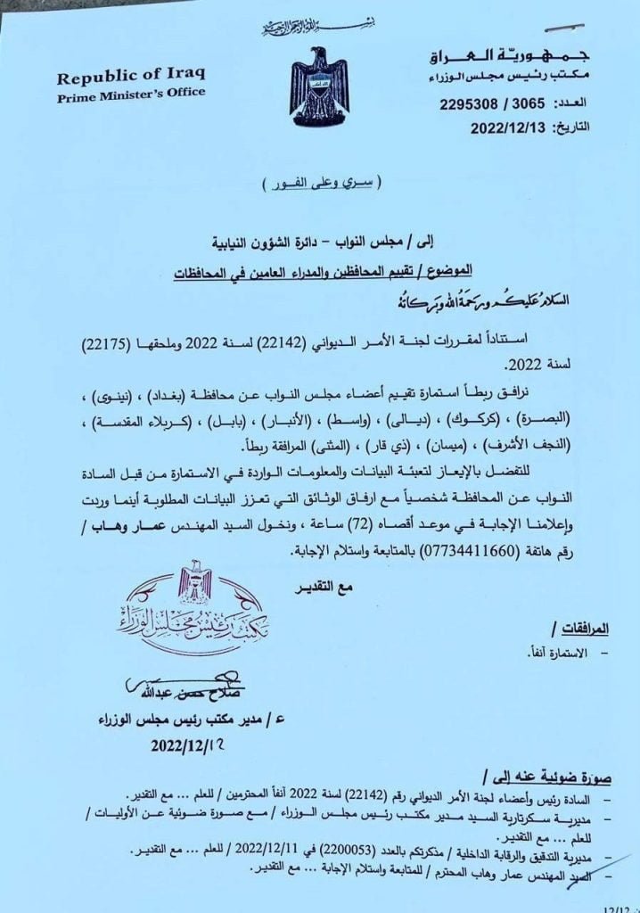 مكتب السوداني يطلق استمارة تقييم عضو مجلس النواب لـ”المحافظ”(وثيقة