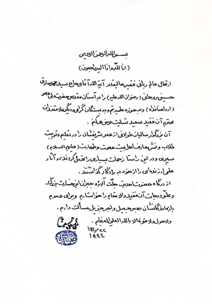 السيد السيستاني يعزي بوفاة المرجع محمد روحاني (وثيقة)
