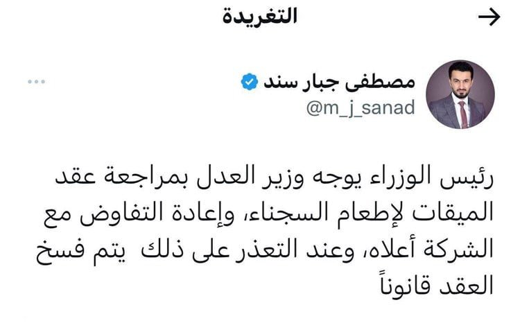 وقال سند، اليوم الثلاثاء، في تغريدة له على “تويتر”، إن رئيس الوزراء وجه وزير العدل بمراجعة عقد الميقات لإطعام السجناء، وإعادة التفاوض مع الشركة أعلاه”.