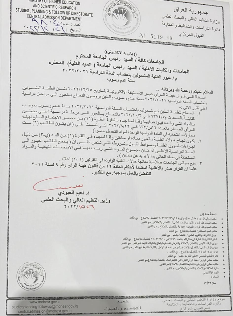 وزير التعليم يقرر السماح بعبور المشمولين بعدم الرسوب مرحلة أعلى مع تحميل المواد التي رقنت قيودهم فيها
