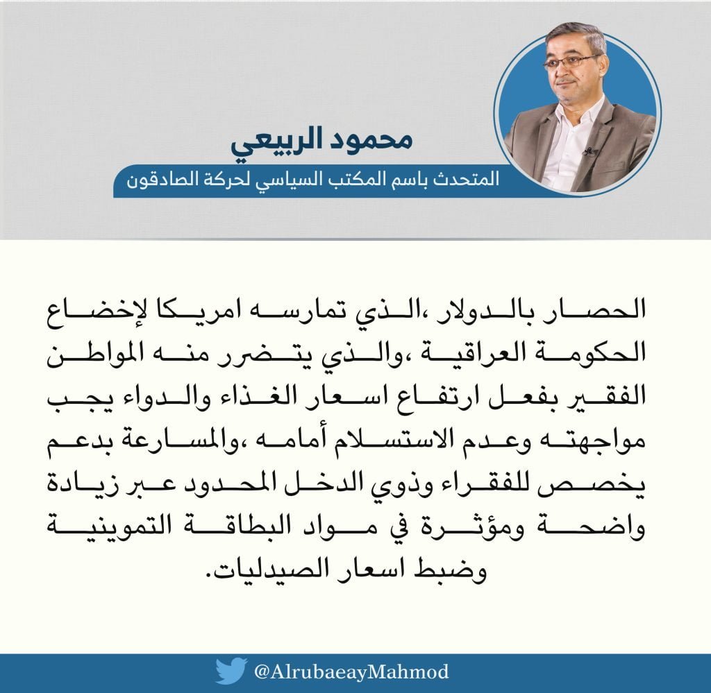 دعا المتحدث باسم المكتب السياسي لحركة الصادقون محمود الربيعي ، اليوم الثلاثاء، الى مواجهة الحصار الذي تمارسه امريكا لإخضاع الحكومة العراقية عبر رفع سعر صرف الدولار. وقال الربيعي في تغريدة على “تويتر” ان الحصار بالدولار ،الذي تمارسه امريكا لإخضاع الحكومة العراقية ،والذي يتضرر منه المواطن الفقير بفعل ارتفاع اسعار الغذاء والدواء يجب مواجهته وعدم الاستسلام أمامه. وشدد الربيعي على ضرورة المسارعة بتقديم دعم يخصص للفقراء وذوي الدخل المحدود عبر زيادة واضحة ومؤثرة في مواد البطاقة التموينية وضبط اسعار الصيدليات.