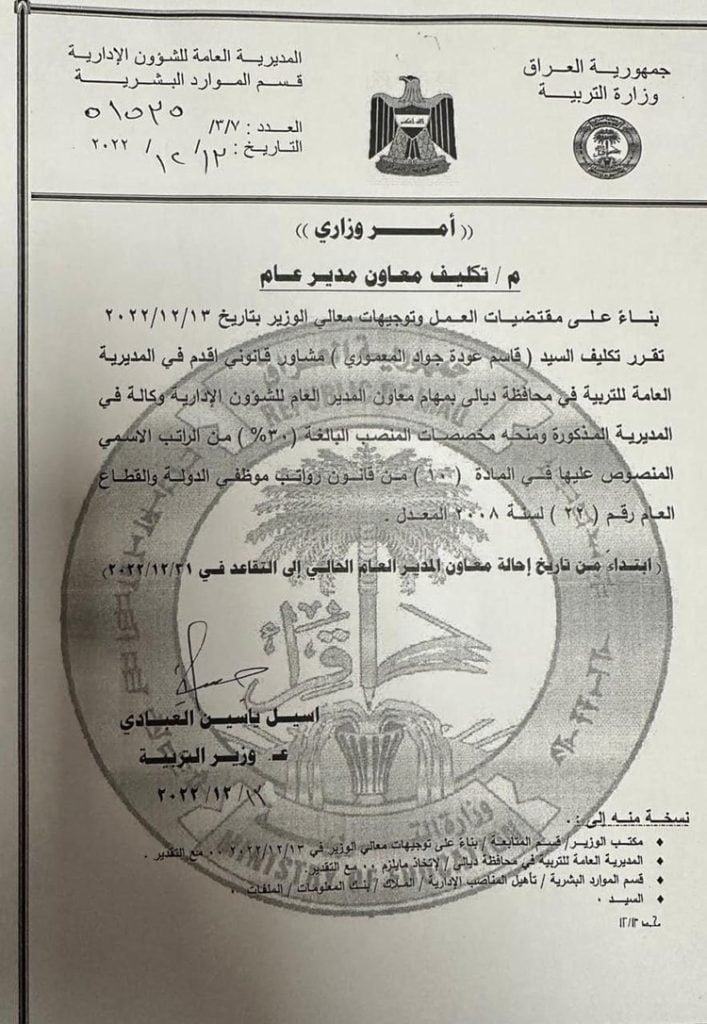 بالوثيقة.. تكليف قاسم عودة بمنصب معاون مدير عام تربية ديالى