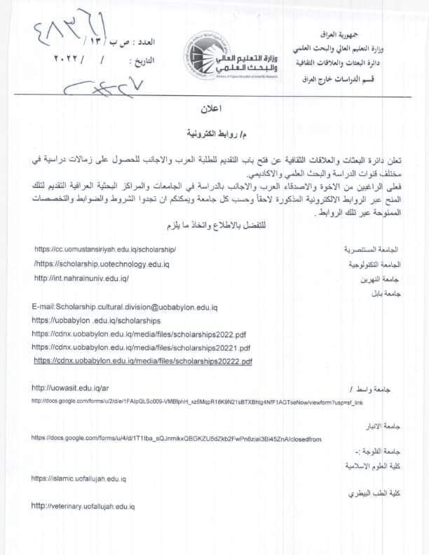 من جانبها اعلنت دائرة البعثات والعلاقات الثقافية عن “فتح باب التقديم للطلبة العرب والاجانب للحصول على زمالات دراسية في مختلف قنوات الدراسة والبحث العلمي الاكاديمي”.