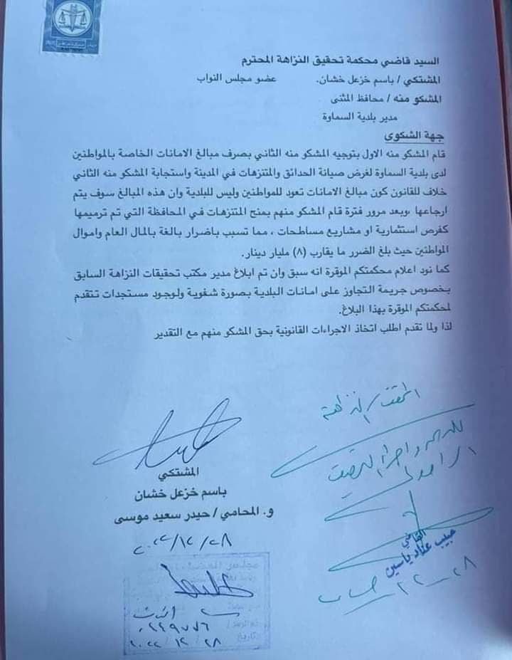 بالوثيقة .. خشان يرفع دعوى ضد محافظ المثنى ومدير بلديه لاهدارهما ٨ مليارات دينار