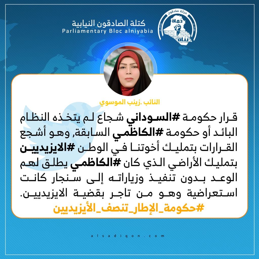 وقالت الموسوي، في تغريدة عبر “تويتر” ان ” قرار حكومة ‎السوداني بتمليك أخوتنا في الوطن ‎الايزيديين الأراضي قرار شجاع لم يتخذه النظام البائد أو حكومة ‎الكاظمي السابقة