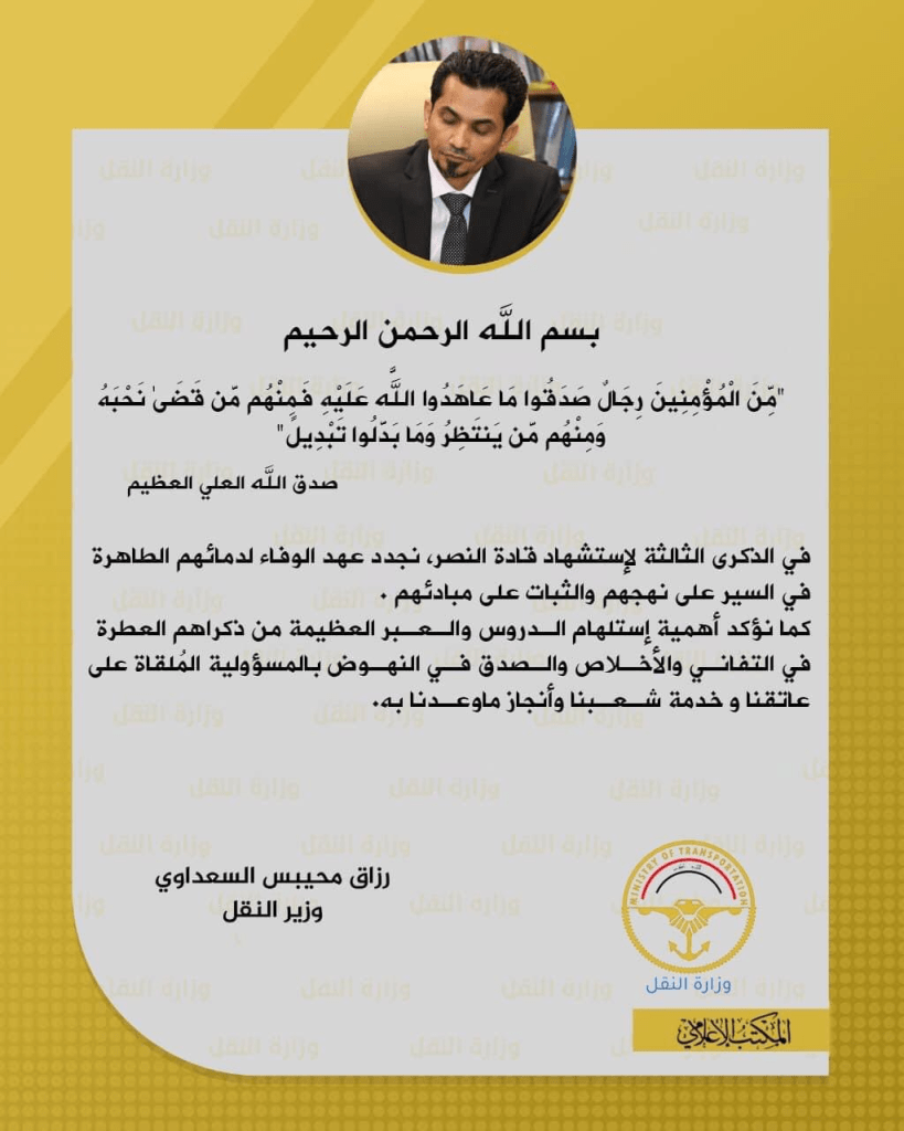 أصدر وزير النقل رزاق محيبس بيان تعزية لماسبة الذكرى الثالثة لاستشهاد قادة النصر أكد فيه عهد الوفاء لدمائهم الطاهرة والثبات على مبادئهم.