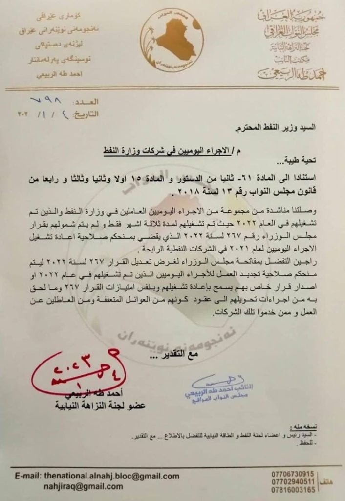 بالوثيقة .. توجيه طلب نيابي لوزير النفط لايجاد حل لعقود لعام 2022