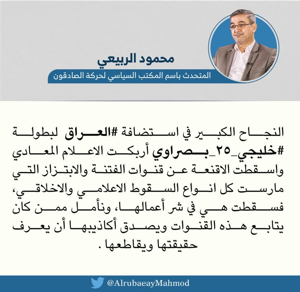 اعتبر المتحدث باسم المكتب السياسي لحركة الصادقون محمود الربيعي ، اليوم السبت، ان النجاح الكبير الذي حققه العراق في استضافة بطولة خليجي ٢٥ أربك الاعلام المعادي و اسقط اقنعته .