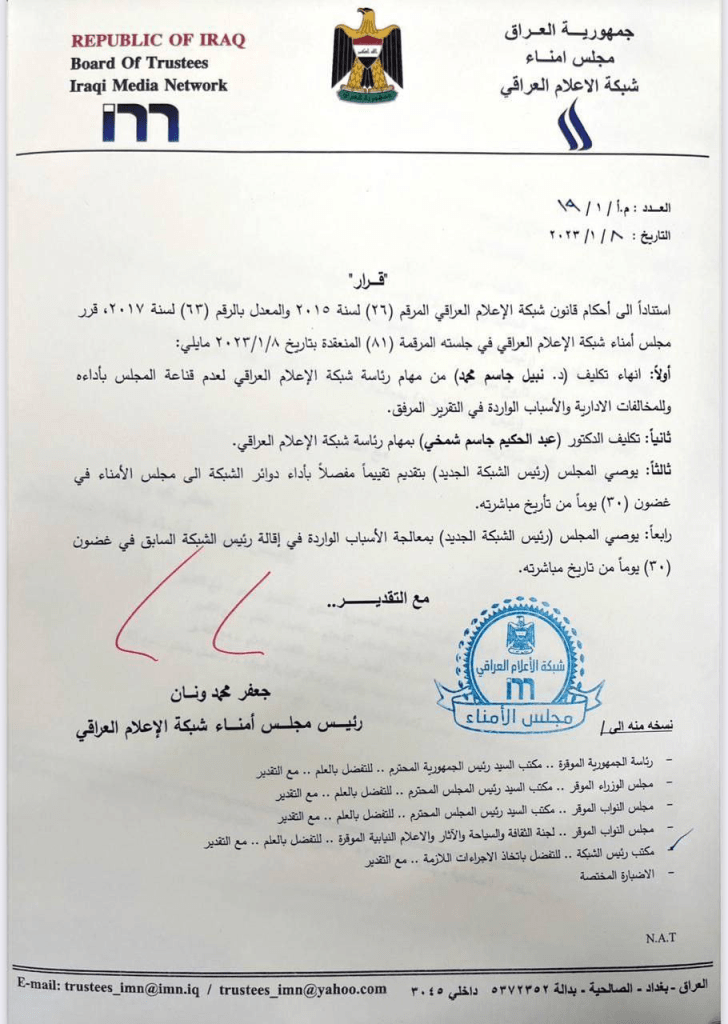 عقد مجلس امناء شبكة الاعلام العراقي اليوم الاحد جلسته الاعتيادية بحضور رئيس المجلس ونائبه واعضاء المجلس، لمناقشة عددا من الموضوعات المدرجة على جدول اعماله. المجلس استعرض عمل المكاتب الخارجية، كما اوصى المجلس رئيس الشبكة بوضع الية لتكريم موظفي الشبكة الحاصلين على شهادتي الماجستير والدكتوراه لعام 2022، وتكريم الموظفين المحالين على التقاعد لعامي 2022 و 2023. المجلس قرر انهاء تكليف رئيس الشبكة د. نبيل محمد جاسم من مهام رئاسته للشبكة لعدم قناعة المجلس بأداءه وللمخالفات الادارية والاسباب الواردة في التقرير المرفق. المجلس قرر تكليف د. عبد الحكيم جاسم شمخي بمهام رئاسة شبكة الاعلام العراقي. المجلس اوصى رئيس الشبكة الجديد بتقديم تقييما مفصلا بأداء دوائر الشبكة الى مجلس الامناء في غضون (30) يوم من تأريخ مباشرته. كما اوصى المجلس رئيس الشبكة الجديد بمعالجة الاسباب الواردة في اقالة رئيس الشبكة السابق في غضون (30) يوم من تأريخ مباشرته. المجلس ناقش عددا من الموضوعات الادارية المدرجة على جدول اعماله.