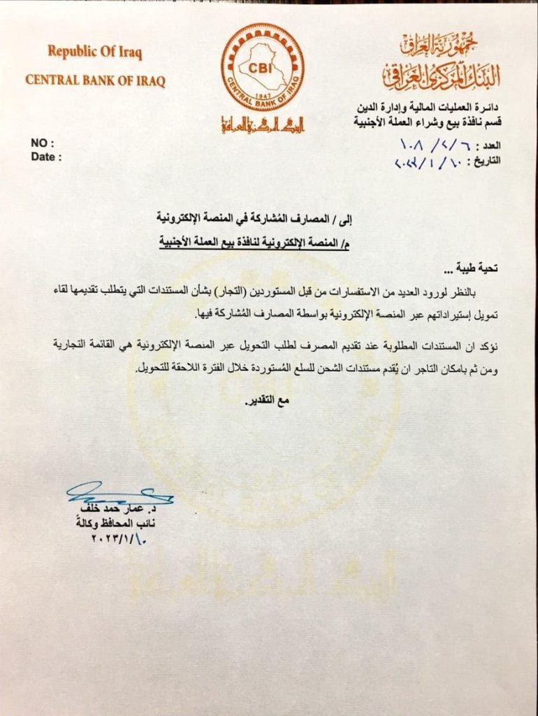 وقال البنك في وثيقة حصلت عليها وكالة مدار الحق إنه “بالنظر لورود العديد من الاستفسارات من قبل المستوردين (التجار) بشأن المستندات التي يتطلب تقديمها لقاء تمويل استيراداتهم عبر المنصة الالكترونية بواسطة المصارف المشاركة فيها”.