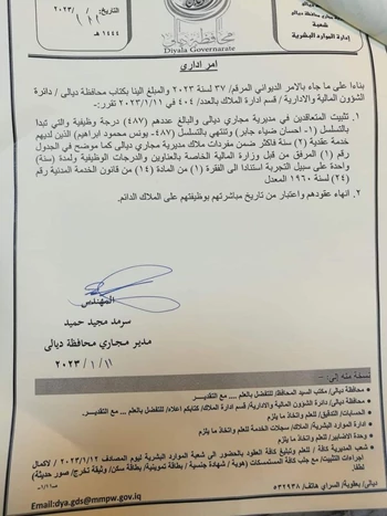 بالوثيقة..تثبيت ٤٨٠ من عقود مجاري ديالى