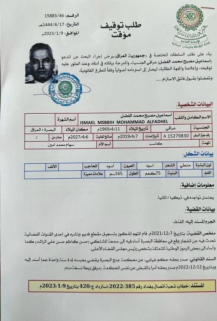 وبحسب وثيقة حصلت عليها وكالة “مدار الحق”، فإن القضاء العراقي أصدر مذكرة توقيف بحق المدعو أسماعيل مصبح الوائلي المحكوم بالحبس غيابياً ويرفعها عبر الأنتربول الدولي من أجل أعادته للعراق.