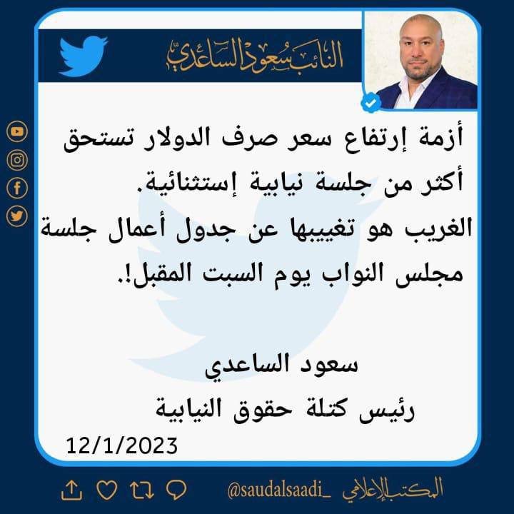 أعرب رئيس كتلة حقوق النيابية سعود الساعدي، عن استغرابه من غياب أزمة ارتفاع الدولار من جلسة البرلمان ليوم السبت المقبل.