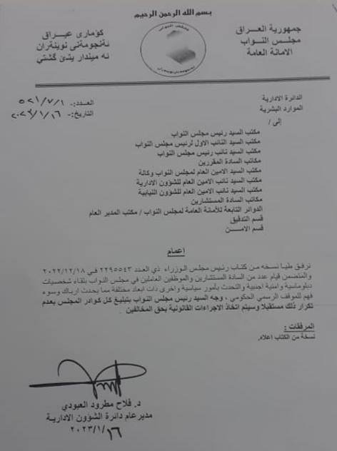 وتضمنت الوثيقة توجيه رئيس مجلس النواب بتبليغ كل كوادر المجلس بعدم تكرار ذلك مستقبلاً، وسيتم اتخاذ الاجراءات القانونية بحق المخالفين.