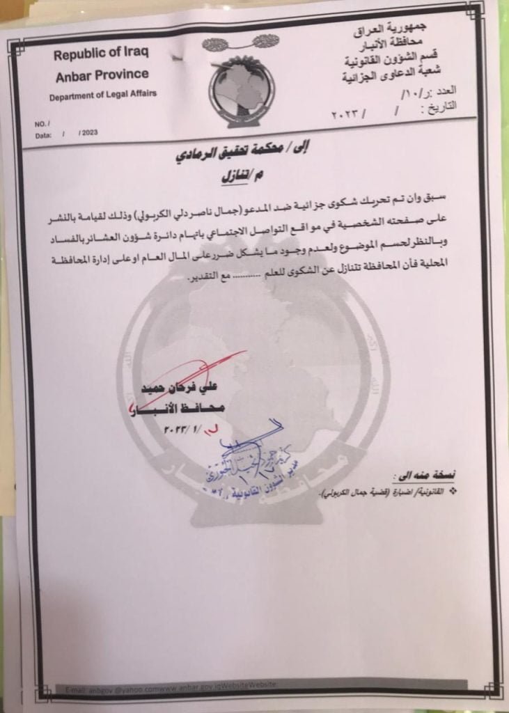 محافظ الانبار يتنازل عن دعوى قضائية رفعها ضد الكربولي (وثيقة)