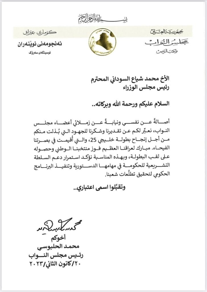 الحلبوسي يشكر السوداني لجهوده في انجاح خليجي 25