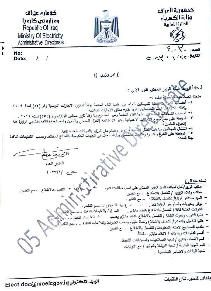بالوثيقة.. وزير الكهرباء يمنح صلاحية احتساب الشهادات العليا خارج نطاق الاجازات الدراسية لموظفي الوزارة