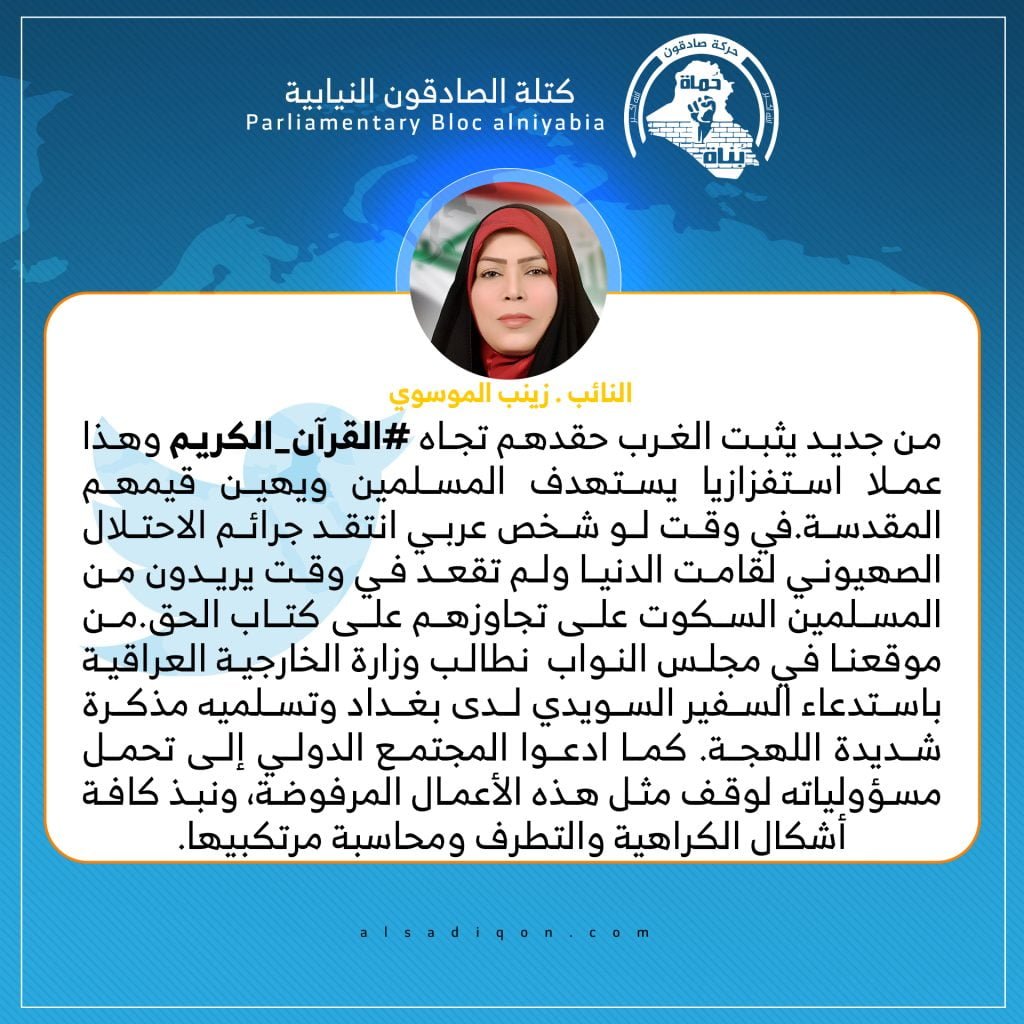 أدانت النائب عن كتلة الصادقون ، زينب الموسوي، الاثنين، حرق المصحف الشريف من قبل جهات متطرفة في السويد ، فيما دعت المجتمع الدولي الى تحمل مسؤولياته لوقف هذه الاعمال التي وصفتها بالاستفزازية .