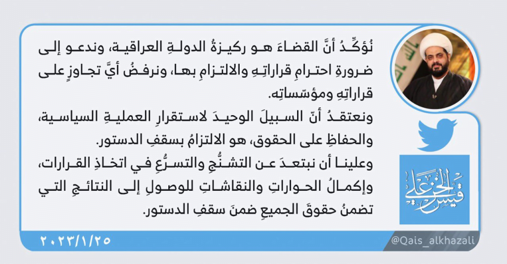 شدد الأمين العام لحركة عصائب أهل الحق، سماحة الشيخ قيس الخزعلي ، اليوم الاربعاء ، على ضرورة احترام قرارات القضاء والالتزام بها بأعتباره ركيزة الدولة ، فيما عبر عن رفضه لأي تجاوز على مؤسساته . وقال سماحة الشيخ الخزعلي ، في تغريدة عبر “تويتر” ، نُؤكِّدُ أنَّ القضاءَ هو ركيزة الدولة العراقية، وندعو إلى ضرورة احترام قراراتِهِ والالتزام بها، ونرفض أي تجاوز علـى قراراته ومؤسساته”. وأضاف سماحته أننا “نعتقد أنّ السبيل الوحيد لاستقرار العملية السياسية والحفاظ على الحقوق، هو الالتزام بسقف الدستور”. واكد سماحته على اهمية الابتعاد عن التشنُّج والتسرع في اتخاذ القرارات، وإكمال الحوارات والنقاشات للوصول إلى النتائج التي تضمن حقوق الجميع ضمن سقف الدستور” .