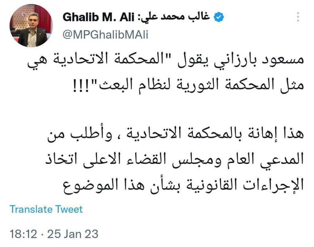 وقال، علي، في تغريدة، على تويتر، اليوم الاربعاء، إن “مسعود بارزاني يقول المحكمة الاتحادية هي مثل المحكمة الثورية لنظام البعث “.