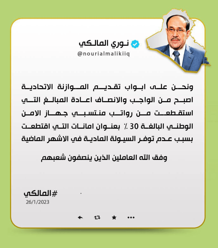 وقال المالكي، اليوم الخميس، في تغريدة تابعتها “مدار الحق”، إنه “نحن على ابواب تقديم الموازنة الاتحادية اصبح من الواجب والانصاف اعادة المبالغ التي استقطعت من رواتب منتسبي جهاز الامن الوطني البالغة 30% بعنوان امانات التي اقتطعت بسبب عدم توفر السيولة المادية في الاشهر الماضية”.