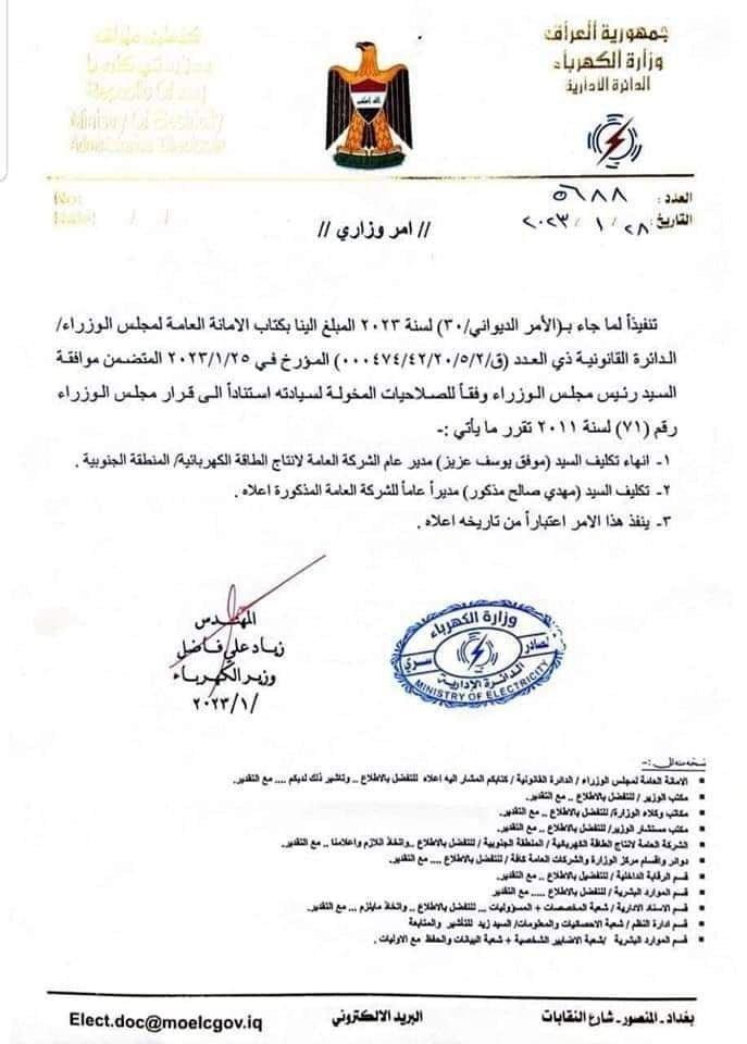 بالوثيقة.. السوداني ينهي تكليف مديري كهرباء الجنوب والفرات الأوسط