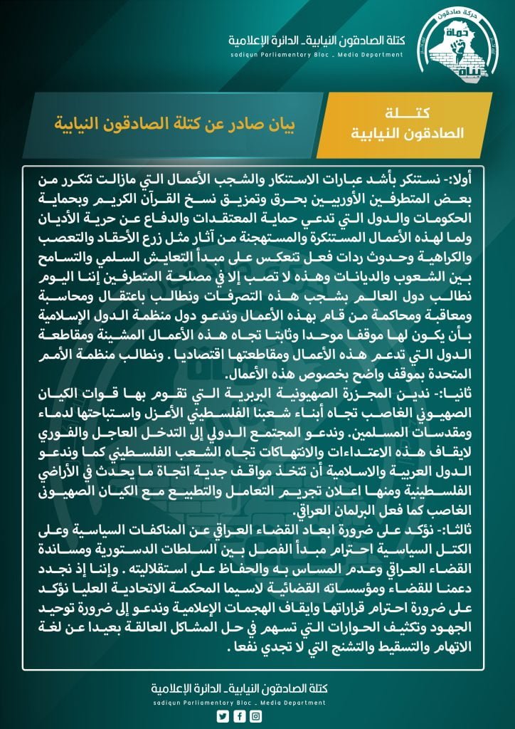 وذكرت كتلة الصادقون في بيان لها ، أنه “نستنكر بأشد عبارات الاستنكار والشجب الأعمال التي مازالت تتكرر من بعض المتطرفين الأوربيين بحرق وتمزيق نسخ القرآن الكريم وبحماية الحكومات والدول التي تدعي حماية المعتقدات والدفاع عن حرية الأديان ولما لهذه الأعمال المستنكرة والمستهجنة من آثار مثل زرع الأحقاد والتعصب والكراهية وحدوث ردات فعل تنعكس على مبدأ التعايش السلمي والتسامح بين الشعوب والديانات”، مبينة أن “هذه لا تصب إلا في مصلحة المتطرفين إننا اليوم نطالب دول العالم بشجب هذه التصرفات ونطالب باعتقال ومحاسبة ومعاقبة ومحاكمة من قام بهذه الأعمال”.
