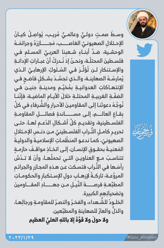 أدان الأمين العام لحركة عصائب أهل الحق ، سماحة الشيخ قيس الخزعلي، الاحد، الجرائم الوحشية المستمرة التي يرتكبها الاحتلال الصهيوني ضد ابناء الشعب الفلسطيني، فيما دعا الاحرار و الشرفاء في العالم الى مساندة فصائل المقاومة حتى تحرير كامل التراب الفلسطيني .