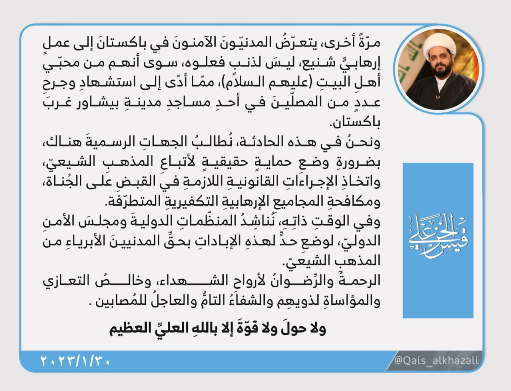 وكتب الشيخ الخزعلي، اليوم الاثنين، في تغريده على تويتر، قائلاً إن “مرّةً أخرى، يتعرّضُ المدنيّونَ الآمنون في باكستان إلى عمل إرهابي شنيع”، مشيراً الى أن “ليسَ لذنب فعلوه، سوى أنهم من محبّي أهل البيت (عليهم السلام)، ممّا أدّى إلى استشهاد وجرح عدد من المصلين في أحد مساجد مدينة بيشاور غرب باكستان”.