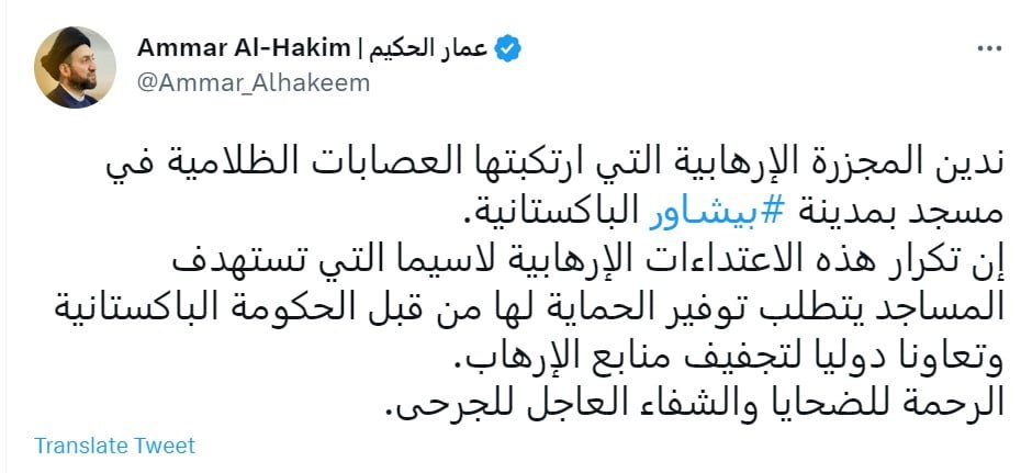 وأضاف الحكيم أن “تكرار هذه الاعتداءات الإرهابية لاسيما تلك التي تستهدف المساجد يتطلب توفير الحماية اللازمة لها من قبل الحكومة الباكستانية وتعاونا دوليا لتجفيف منابع الإرهاب المالية والفكرية”.