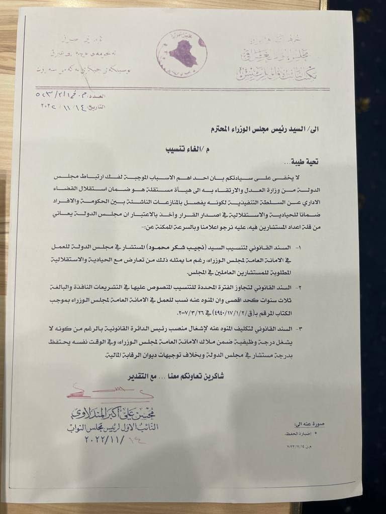 خاطب النائب الاول لرئيس مجلس النواب، محسن المندلاوي، رئيس الوزراء محمد شياع السوداني، بشأن الغاء تنسيب نجيب شكر.