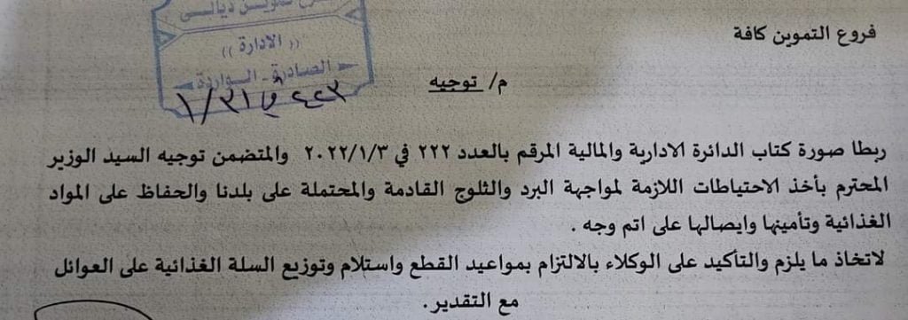 أصدرت وزارة التجارة، توجيهاً الى وكلاء المواد الغذائية والطحين بشان مواد السلة الغذائية للحفاظ عليها من موجات البرد والثلوج القادمة.وذكرت وثيقة صادرة بتاريخ 31 من شهر كانون الثاني الماضي وحصلت عليها وكالة مدار الحق، أن “وزير التجارة اثير داوود الغريري وجه بأخذ الاحتياطات اللازمة لمواجهة البرد والثلوج القادمة والمحتملة على بلدنا والحفاظ على المواد الغذائية وتأمينها وايصالها على اتم وجه