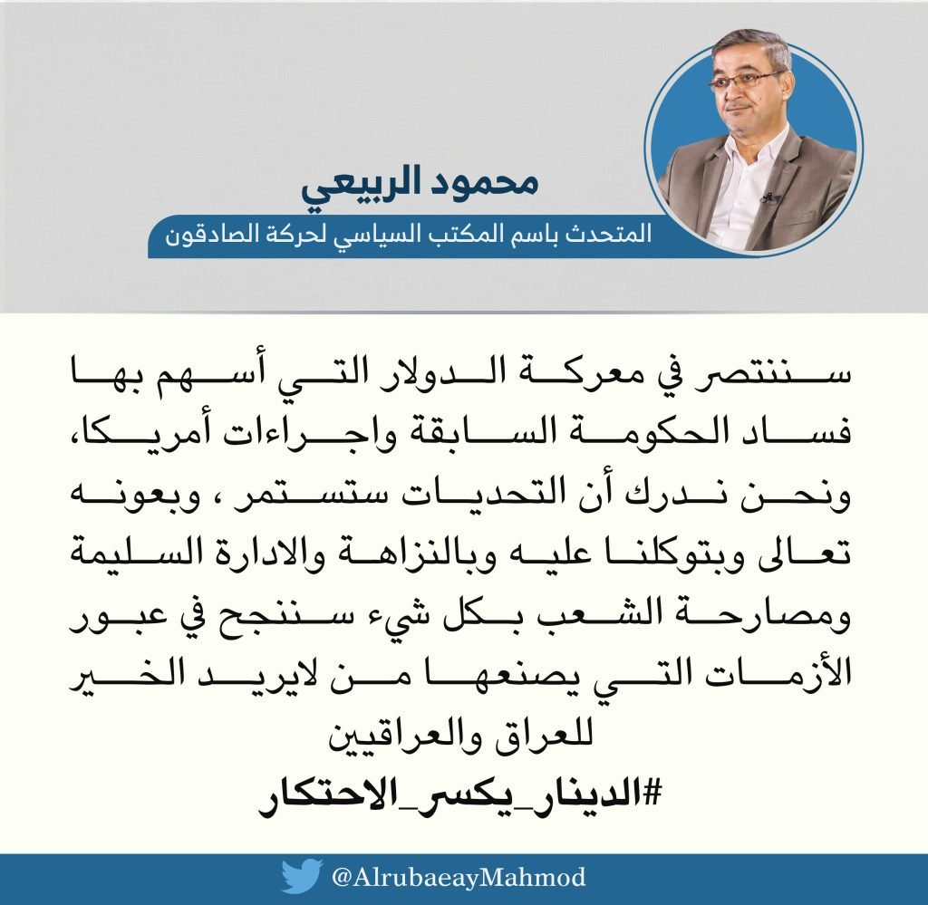 وكتب الربيعي ، في تغريدة على “تويتر” قائلاً , سننتصر في معركة الدولار التي أسهم بها فساد الحكومة السابقة واجراءات أمريكا، ونحن ندرك أن التحديات ستستمر .