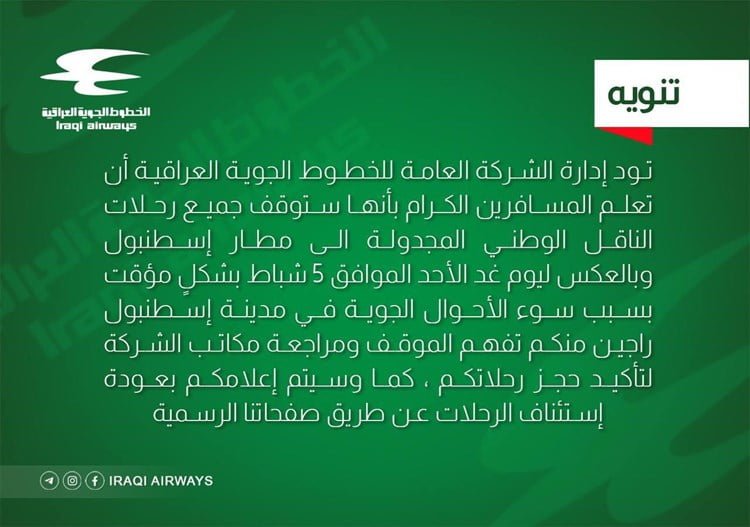 الخطوط الجوية العراقية تعلن إيقاف جميع رحلاتها إلى إسطنبول