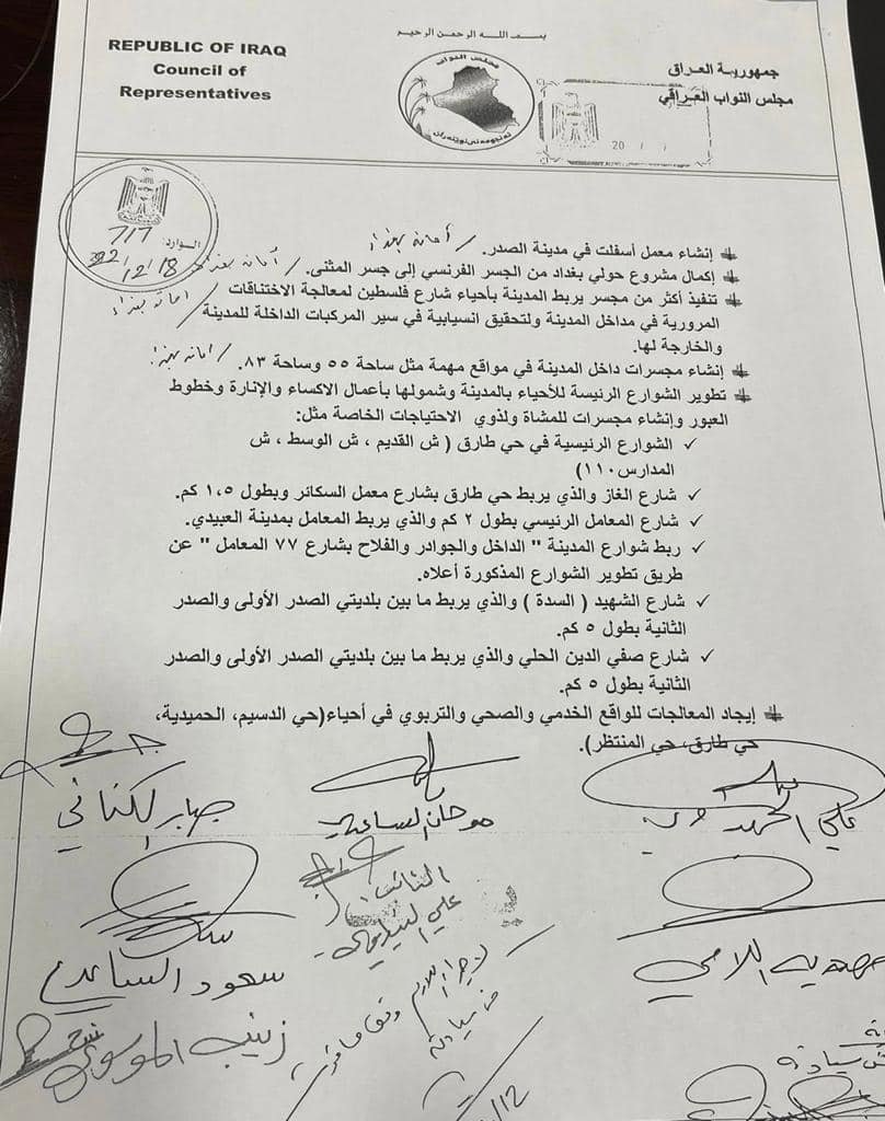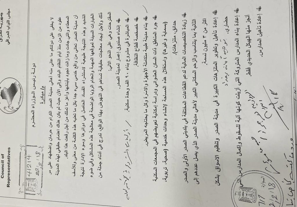 السوداني يوافق على مبادرة نيابية لبناء 90 الف وحدة ومدينة طبية متكاملة سكنية بمدينة الصدر (وثائق)