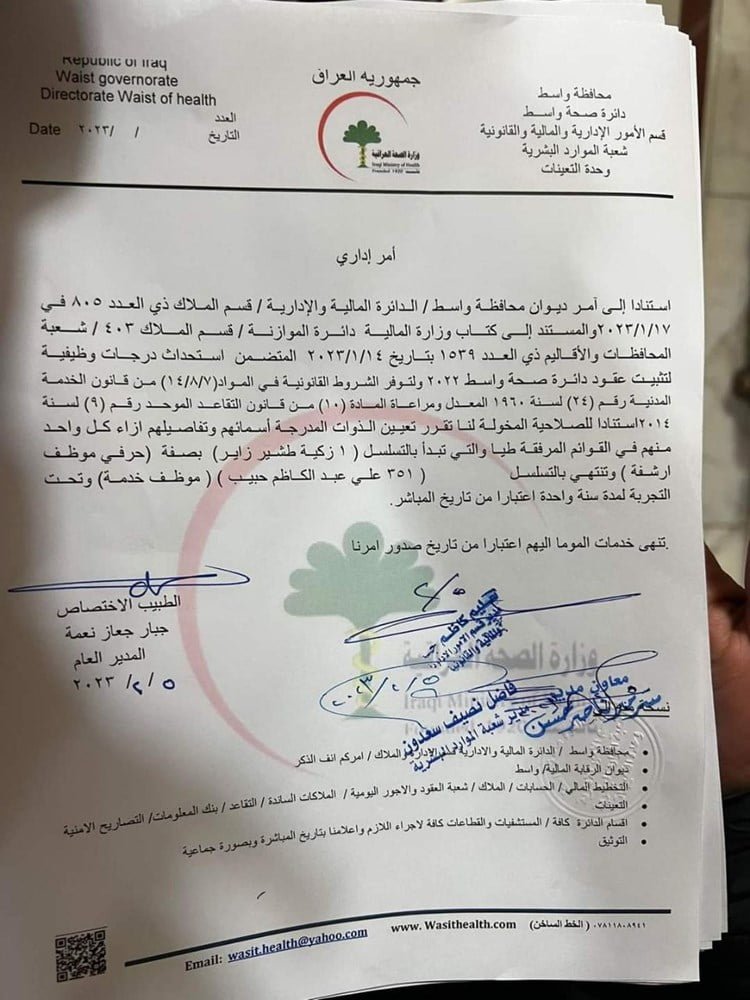 بالوثيقة..صحة واسط تنجز الوجبة الأولى من تثبيت المتعاقدين على الملاك الدائم