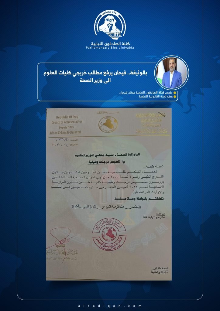 رفع رئيس كتلة الصادقون النيابية عدنان فيحان، اليوم الاحد، طلباً لوزارة الصحة بشان تخصيص درجات وظيفية لخريجي كليات العلوم.