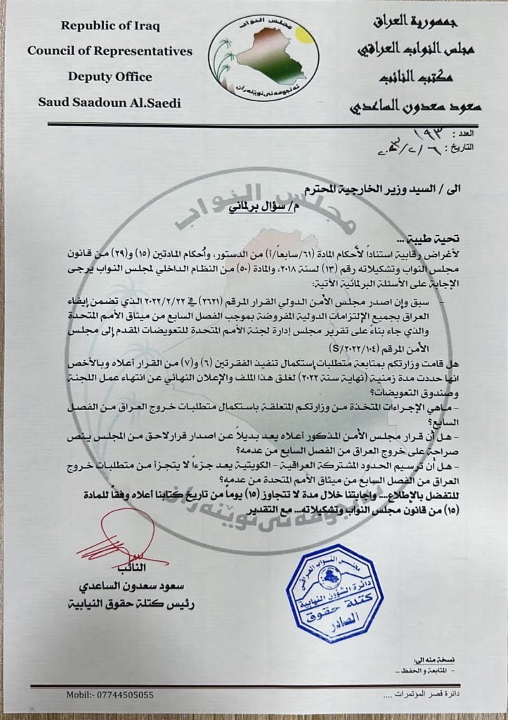 حصلت وكالة مدار على وثيقة صادرة من رئيس كتلة حقوق النيابية النائب سعود الساعدي، وموجهة إلى وزارة الخارجية بشأن إجراءاتها المحددة بتوقيتات زمنية لإستكمال متطلبات إخراج العراق من الفصل السابع.