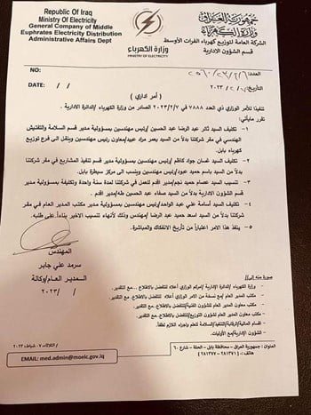 بالوثيقة.. تغييرات ادارية في شركة توزيع كهرباء الفرات الأوسط