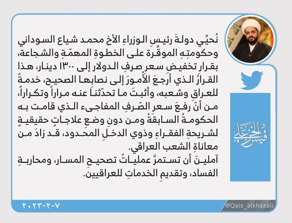 و قال سماحة الشيخ الخزعلي ، في تغريدة عبر “تويتر” ، انه يحيي دولة رئيس الوزراء الأخ محمد شياع السوداني وحكومته الموقرة على الخطوة المهمة والشجاعة بقرار تخفيض سعر صرف الدولار إلى ۱۳۰۰ دينار”، مشيراً الى ان “هذا القرار الذي أرجع الأمور إلى نصابها الصحيح، خدمةً للعراق وشعبه، وأثبت ما تحدّثنا عنه مراراً وتكراراً”.