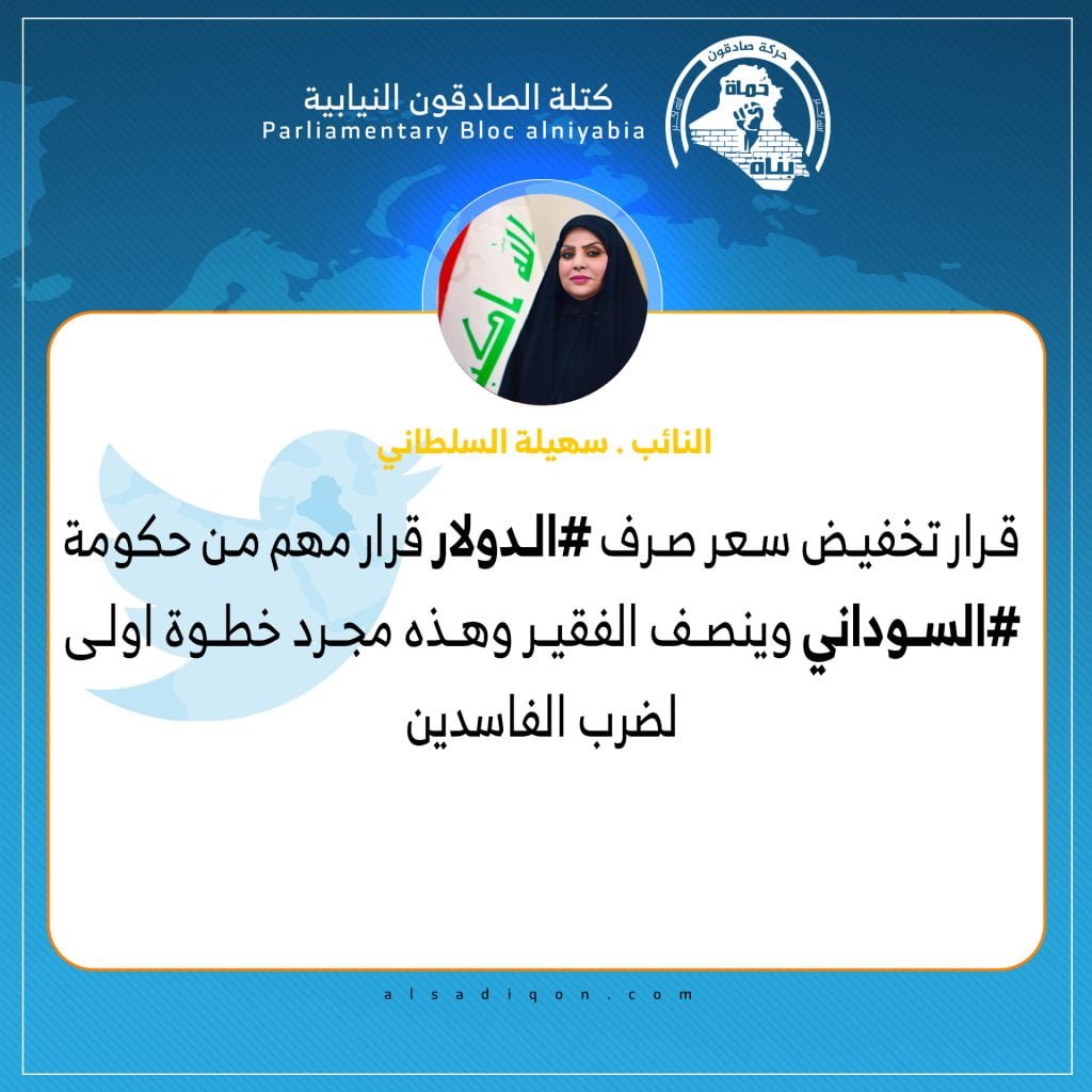 وقالت السلطاني في تغريدة على “تويتر” ، ان قرار تخفيض سعر صرف ‎الدولار قرار مهم من حكومة قبل السوداني