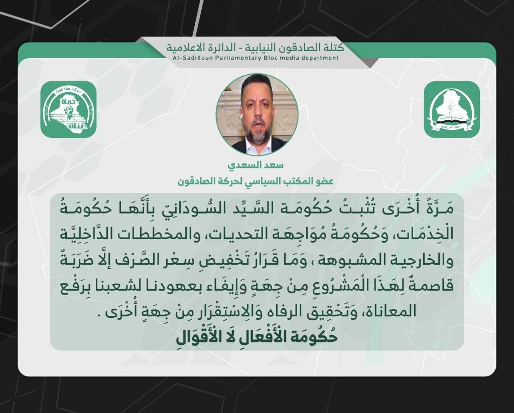 اكد عضو المكتب السياسي لحركة الصادقون ، سعد السعدي ، الثلاثاء ، ان حكومة السوداني اثبتت بأنها حكومة خدمات ، مؤكدا قدرتها على مواجهة التحديات و المخططات المشبوهة .