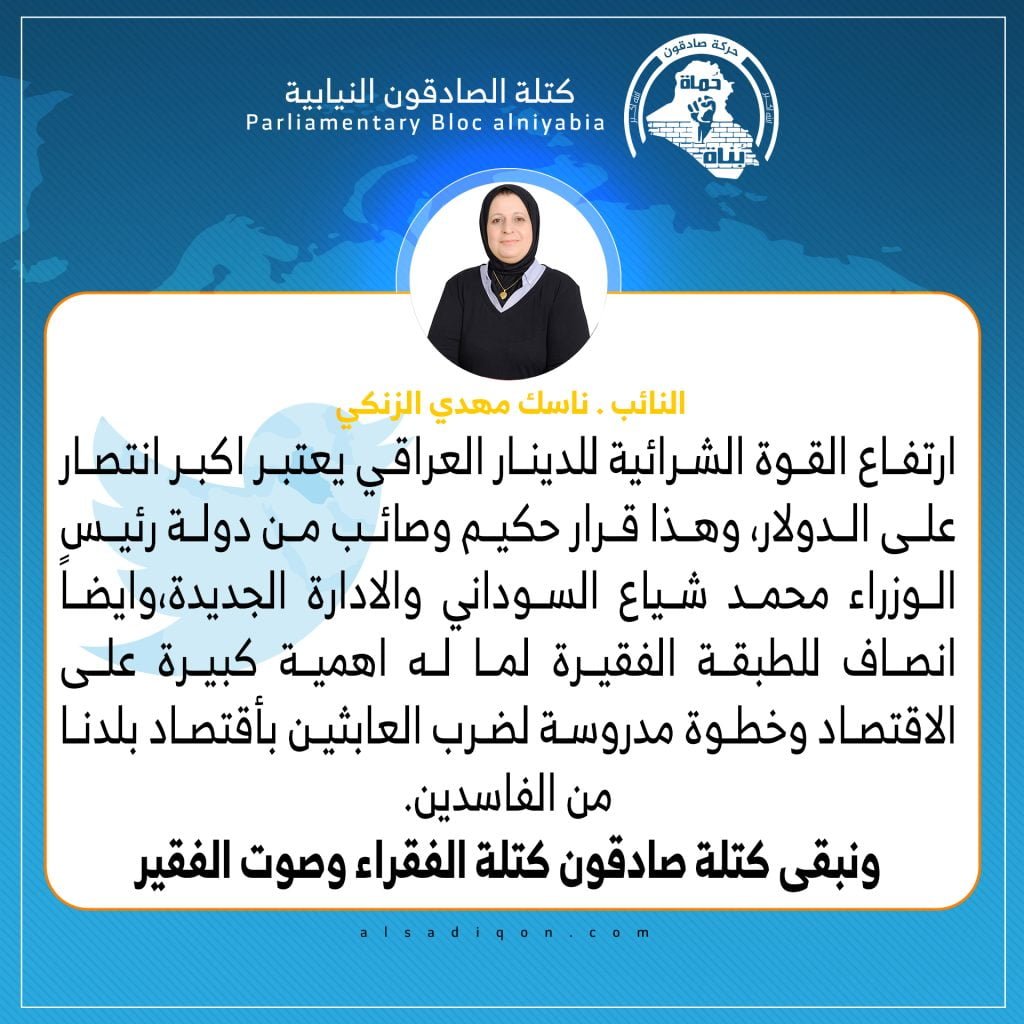 اعتبرت النائب عن كتلة الصادقون ، نازك الزنكي ، الثلاثاء، قرار تخفيض سعر صرف الدولار في الموازنة بأنه قرار حكيم و صائب و من شأن رفع القدرة الشرائية للدينار و انصاف الفقراء .