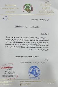 واظهرت وثيقة رسمية وقعها اعضاء كتلة الصادقون ، مخاطبة هيئة الاعلام والاتصالات للتأكيد على قرار سحب رخصة قناة (Utv) بعد الاساءة التي صدرت من القناة بحق اهل الجنوب من خلال مسلسل (الكاسر) الثي تبثه القناة .