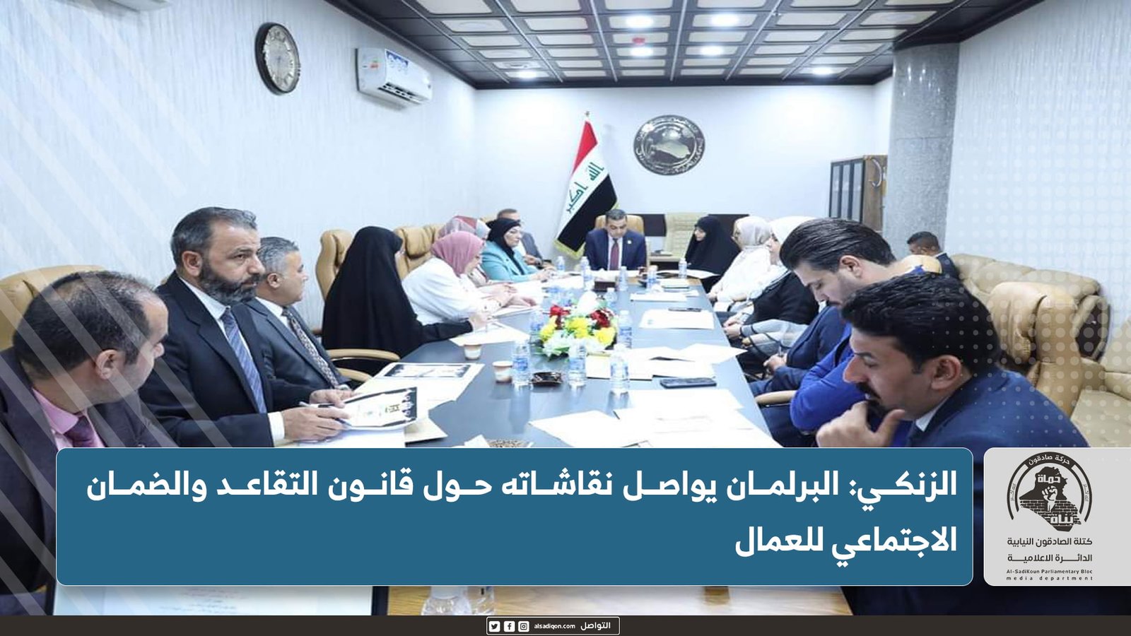 وذكر بيان للمكتب الأعلامي للزنكي ، ان لجنة العمل ومنظمات المجتمع المدني استضافت ، السيدة سناء الموسوي مستشارة رئيس الوزراء للشؤون الاجتماعية وممثل عن دائرة التقاعد والضمان الاجتماعي، بحضور وفد منظمة العمل الدولية، لمناقشة قانون التقاعد والضمان الاجتماعي للعمال.