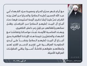 وكتب الشيخ الخزعلي في تدوينه على موقع “اكس”، إنه ” مع أيام شهر محرم الحرام، ومصيبة سيّد الشهداء أبي عبد الله الحسين (عليه السلام)، والسبايا من أهل بيته الكرام، تمرُّ علينا أيضًا ذكرى أليمة استبيحت فيها دماء أتباع آل البيت عليهم) (السلام من التركمان، وقتل نسائهم وأطفالهم من قبل زمر داعش التكفيري”.