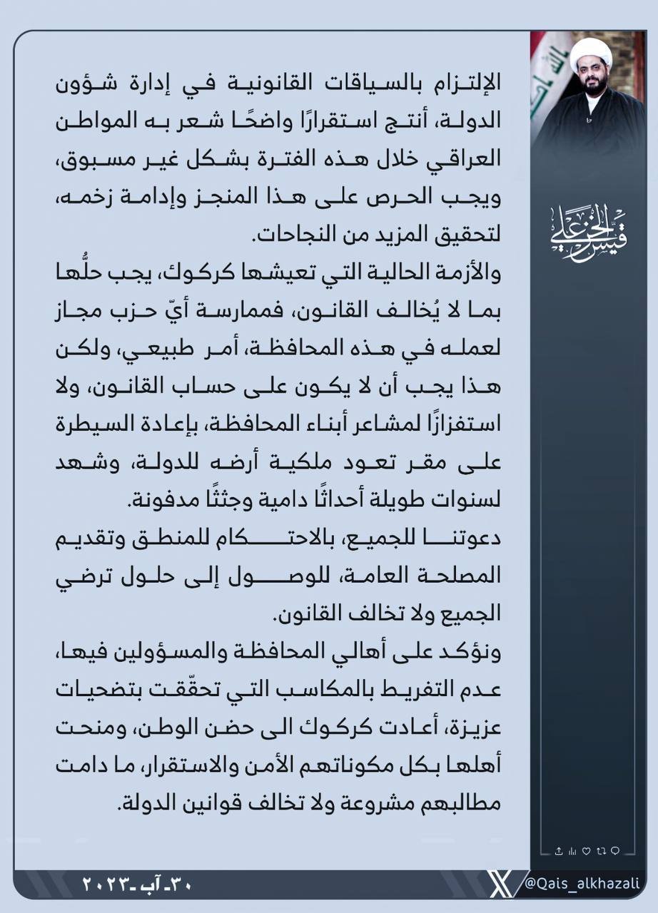 دعا الأمين العام لحركة عصائب أهل الحق، سماحة الشيخ قيس الخزعلي، اليوم الأربعاء، الى حل الأزمة في كركوك وفق السياقات القانونية و الأبتعاد عن أستفزاز أبنائها، مؤكدا أهمية الحفاظ على المكاسب التي تحققت بإعادة المحافظة الى أرض الوطن .